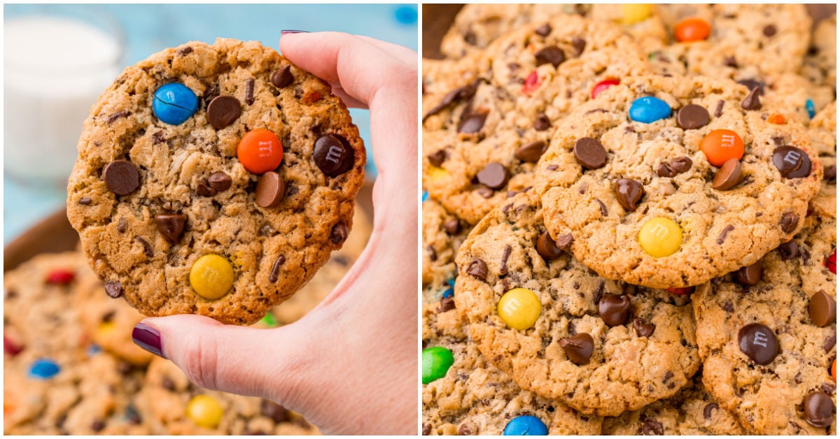Delicious and chewy monster cookies loaded with M&Ms, chocolate chips, and oats.
