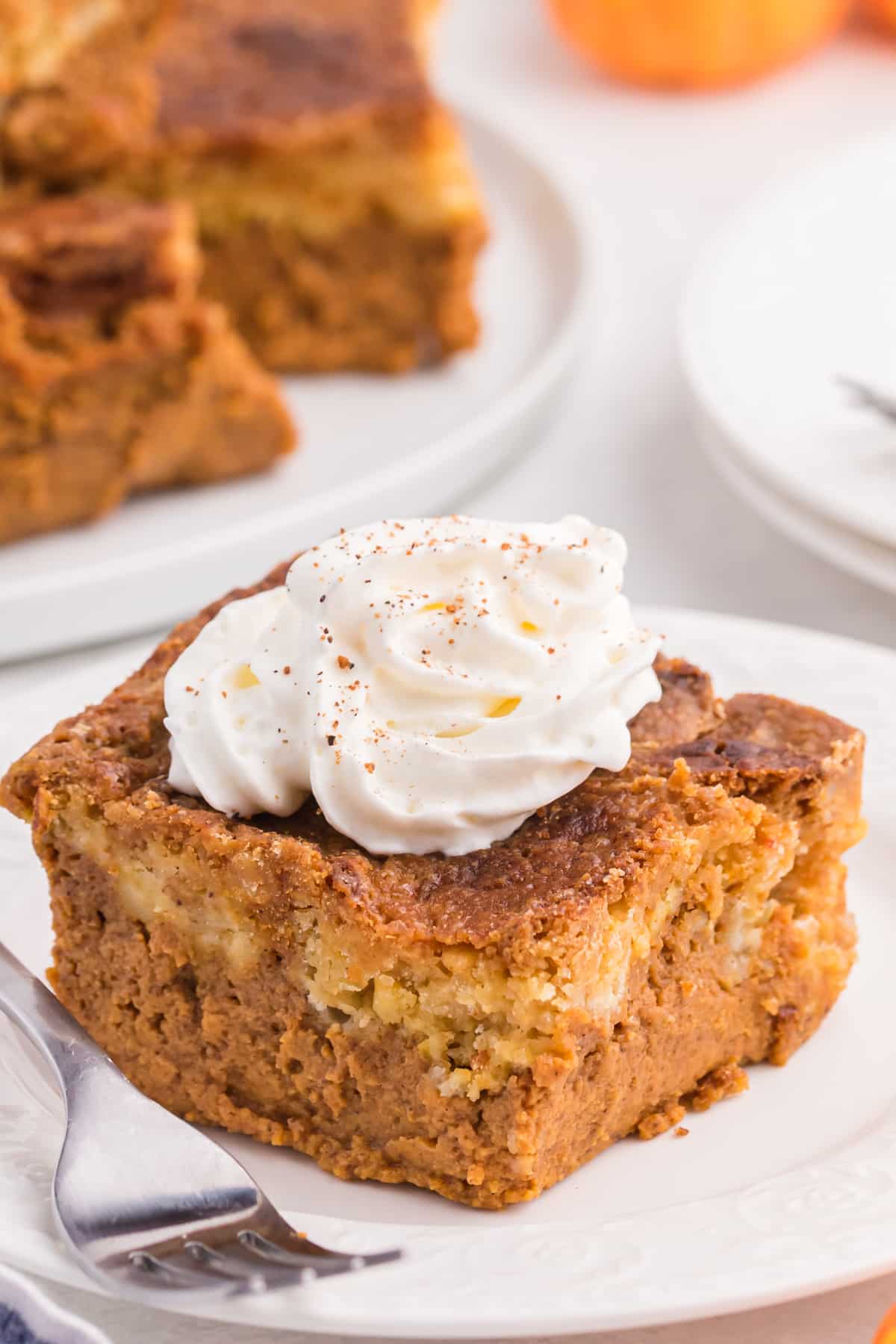 A delicious pumpkin dessert with a creamy filling and a cake-like topping, perfect for fall occasions.