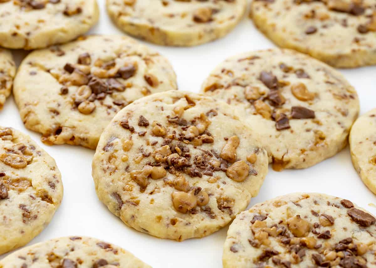 - Remove dough from fridge, slice into ¼-inch cookies, and place on baking sheets about 1 inch apart. Top with reserved toffee bits.