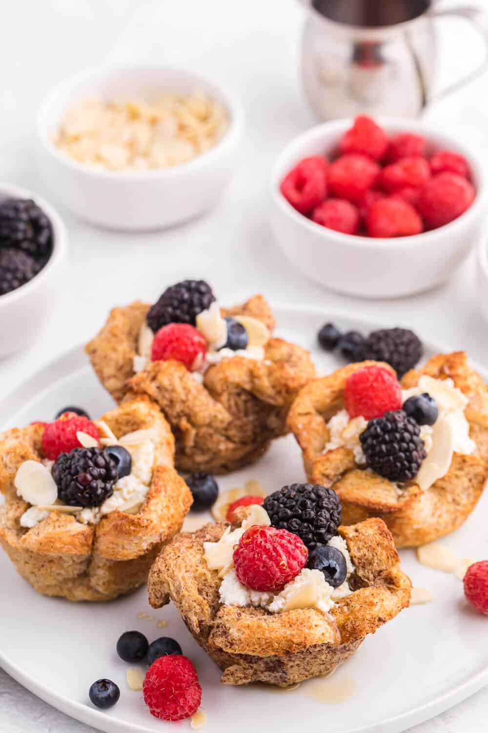 - Spoon equal amounts of ricotta cheese into each bread cup, top with berries, sliced almonds, and a drizzle of maple syrup.