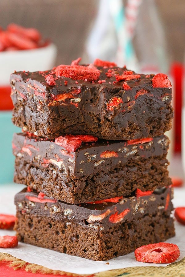 A delicious recipe for fudgy strawberry brownies with a dense chocolate base topped with dried strawberries.