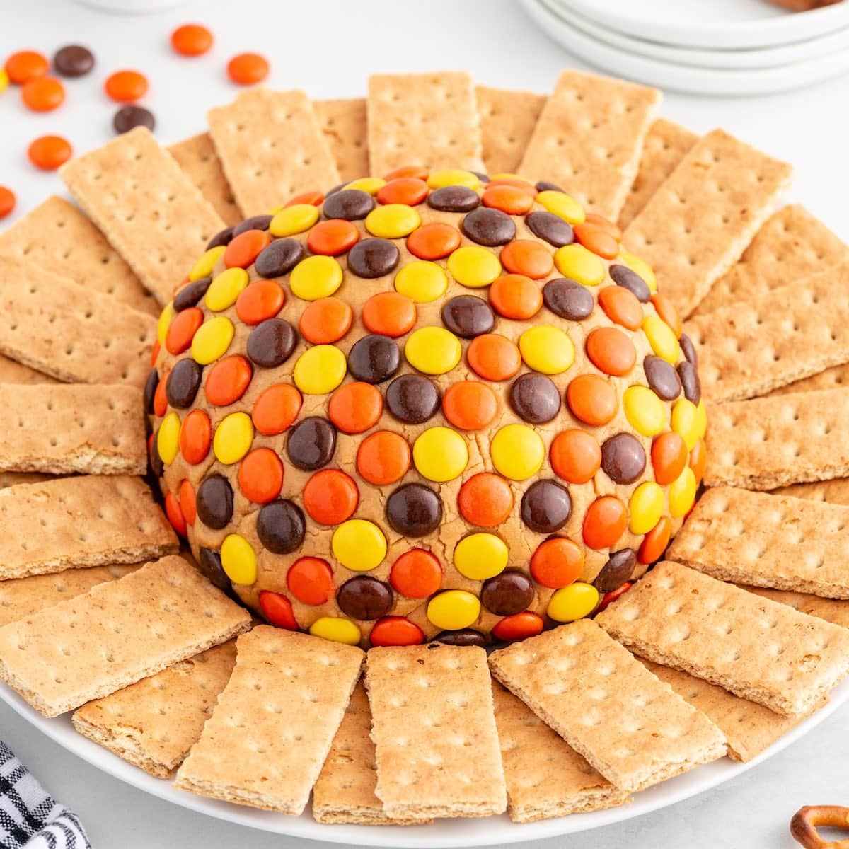 - Gently press Reese’s Pieces onto the surface of the peanut butter ball for decoration. Arrange graham cracker pieces around the ball for presentation.