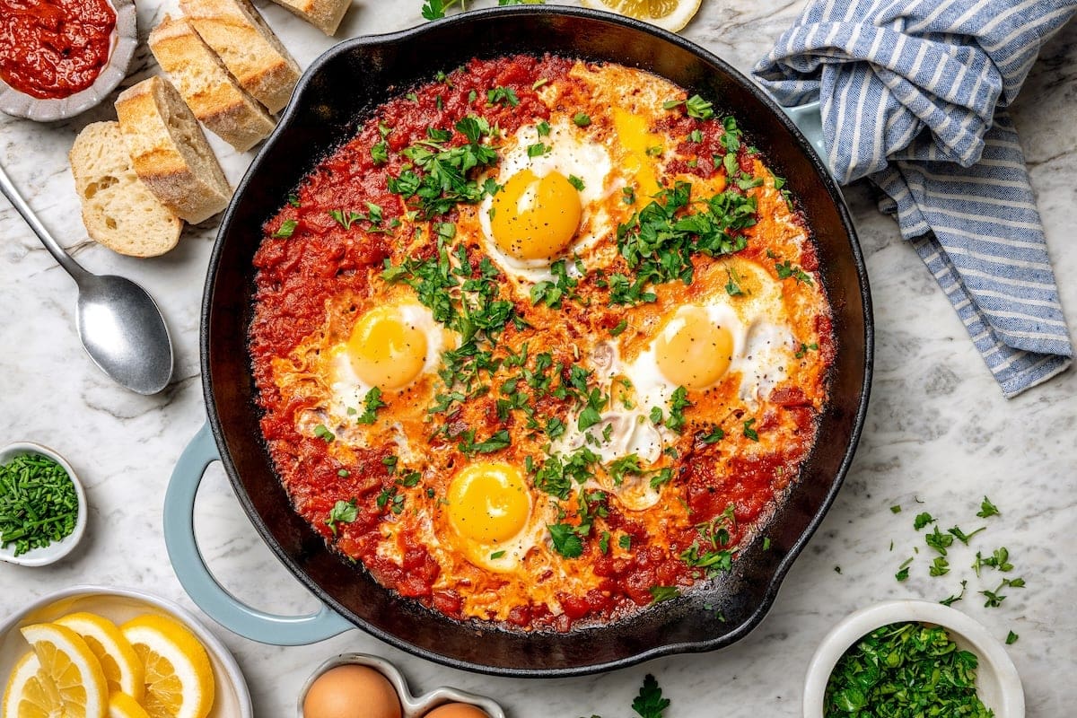 - Reduce heat to medium-low. Carefully crack the eggs into the sauce, season with salt and pepper, and cover the skillet.